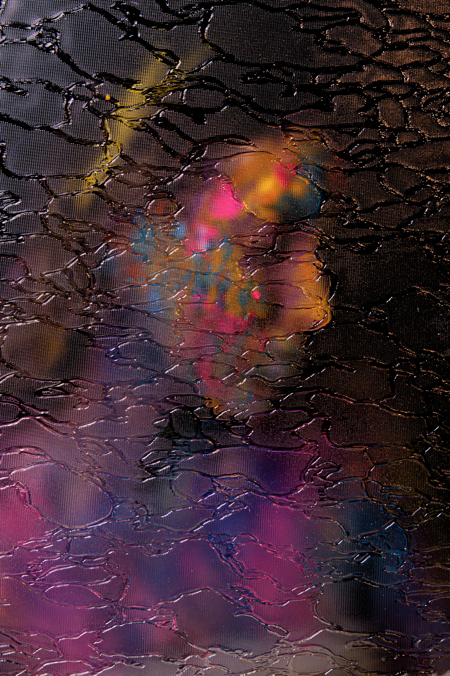 Imaginea are ceva nocturn și urban — poate lumini de oraș filtrate printr-o suprafață crăpată, poate un neon care se dizolvă în ploaie. În același timp, are și ceva cosmic: o nebuloasă prinsă într-o rețea de fisuri, un univers microscopic văzut prin lentila unei emoții.