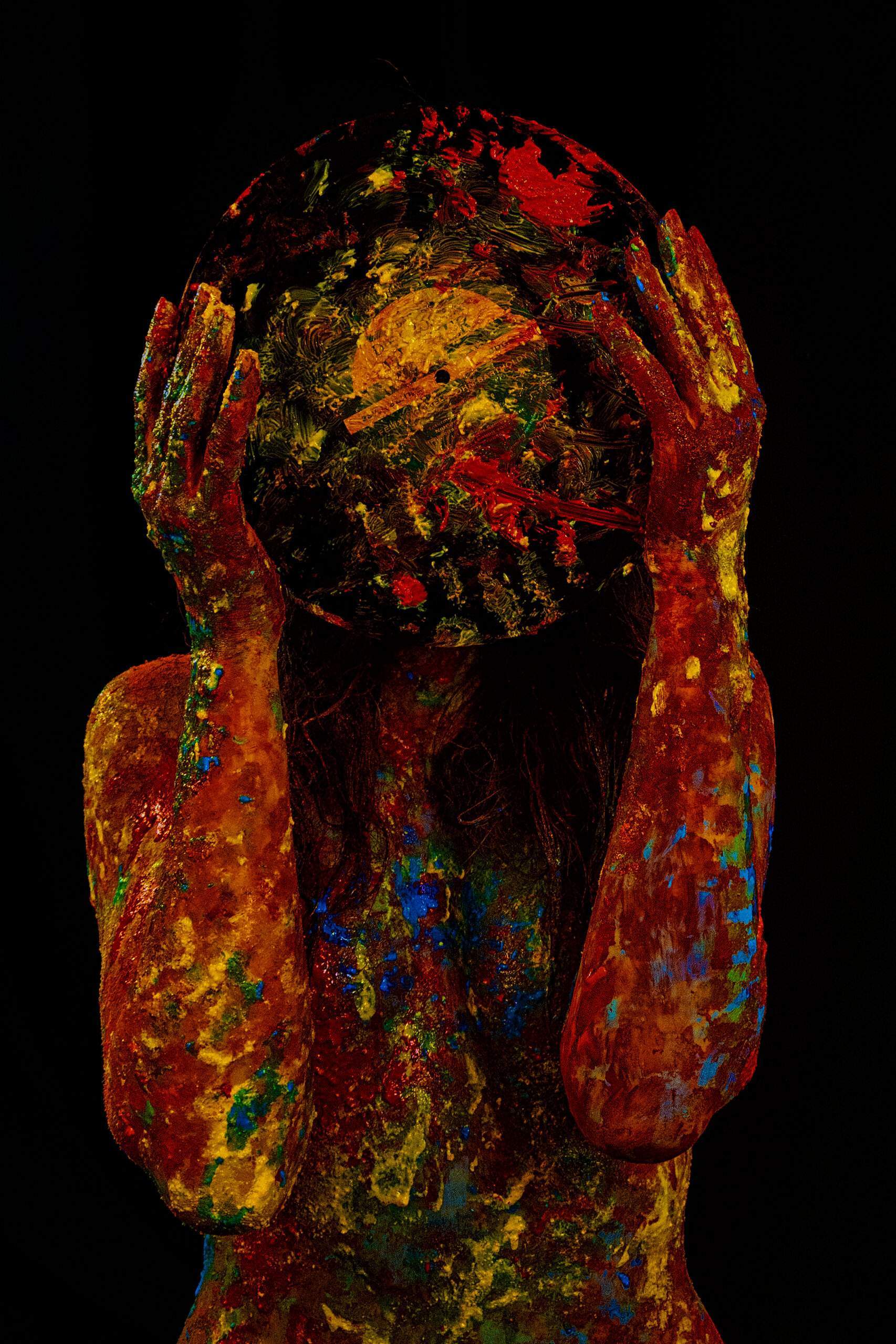O figură fără chip își ascunde capul într-o planetă improvizată din sunet și pigment, ca și cum ar ține între palme propria furtună. Roșul devine carne, galbenul devine zgomot, albastrul devine rest de ecou. Muzica nu se vede, dar apasă.