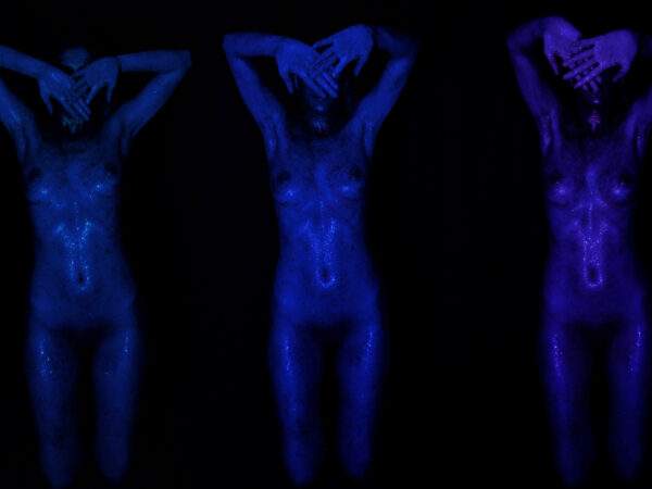 Fotografia surprinde o siluetă împodobită cu o tapiserie vibrantă de vopsea fluorescentă pentru corp, iluminată pe fundalul unui vid negru absolut. Violetul electric, portocaliul aprins și verdele viu curg pe piele, creând un efect dinamic, aproape pictural. Silueta este așezată într-o postură aplecată, interacționând cu o suprafață reflectorizantă, unde un vârtej luminos de vopsea galbenă și verde emană dintr-o mână, adăugând un element gestual puternic. Tipărită cu o claritate excepțională pe forex durabil, lucrarea pune accentul pe reproducerea strălucitoare a culorilor și pe energia vizuală izbitoare.