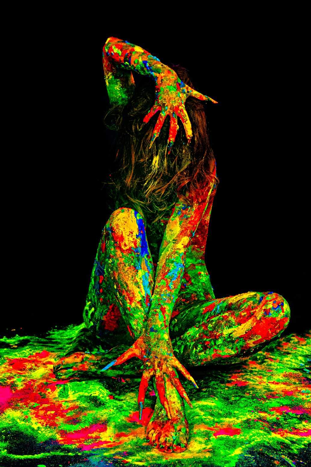 Așezată la pământ, cu genunchii strânși și brațul arcuit peste chip, silueta nu se ascunde — se aprinde. Degetele răsfirate taie aerul ca niște flăcări vii, iar pigmentul, crud și incandescent, nu stă pe piele, ci o devorează. Verdele mușcă, roșul arde, galbenul izbucnește ca o explozie solară, albastrul pulsează rece ca un fulger prins sub epidermă.