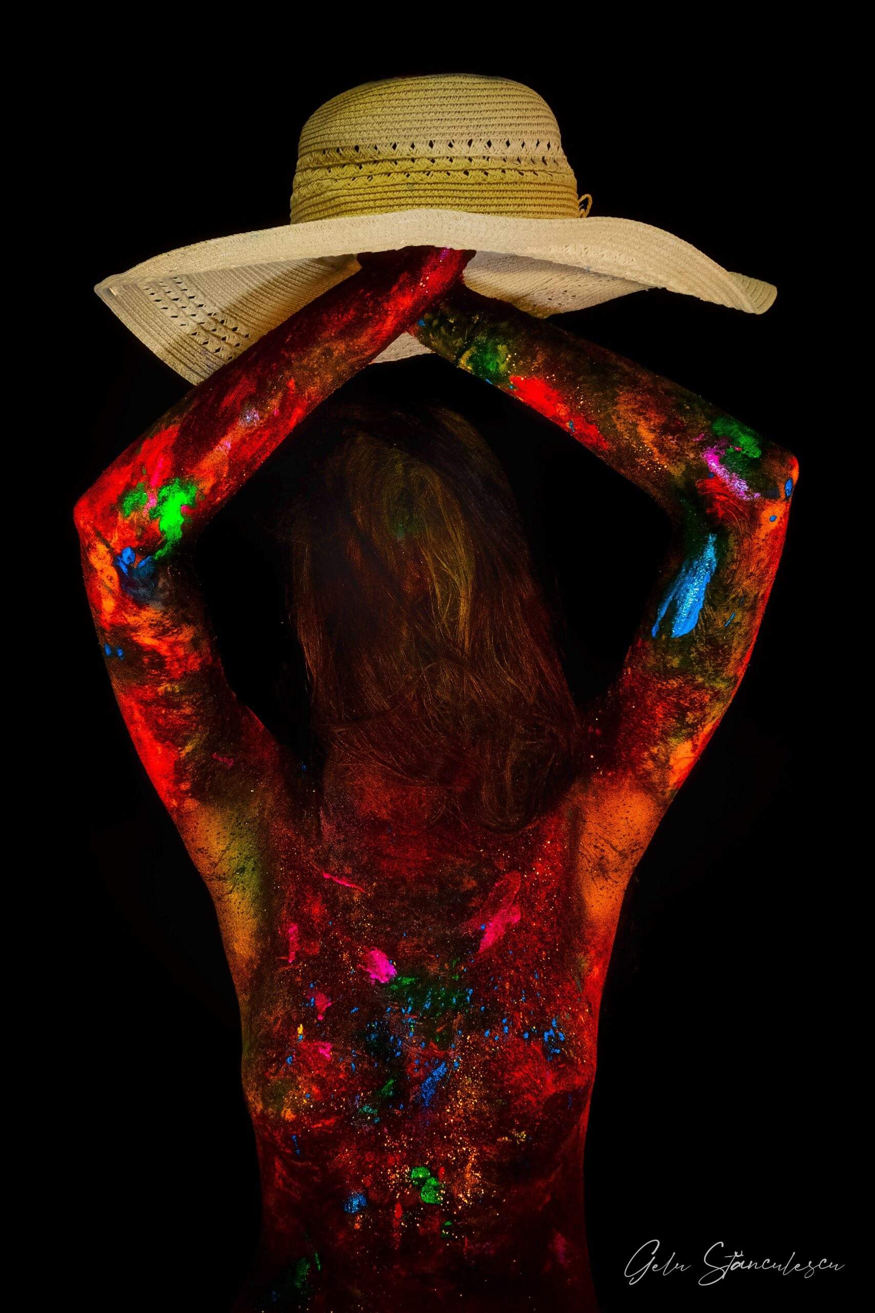Lucrarea aceasta surprinde o siluetă văzută din spate, cu brațele ridicate pentru a ține o pălărie de paie, care îi ascunde chipul. Corpul este iluminat dramatic, acoperit de o tapiserie vibrantă de nuanțe strălucitoare de roșu, portocaliu și galben, punctată de pete electrice de verde, albastru și roz. Această lucrare fotografică transformă forma umană într-o pânză dinamică și abstractă, unde lumina și culoarea se contopesc pe fundalul unui vid negru profund, creând un sentiment atât de ascundere, cât și de energie radiantă.