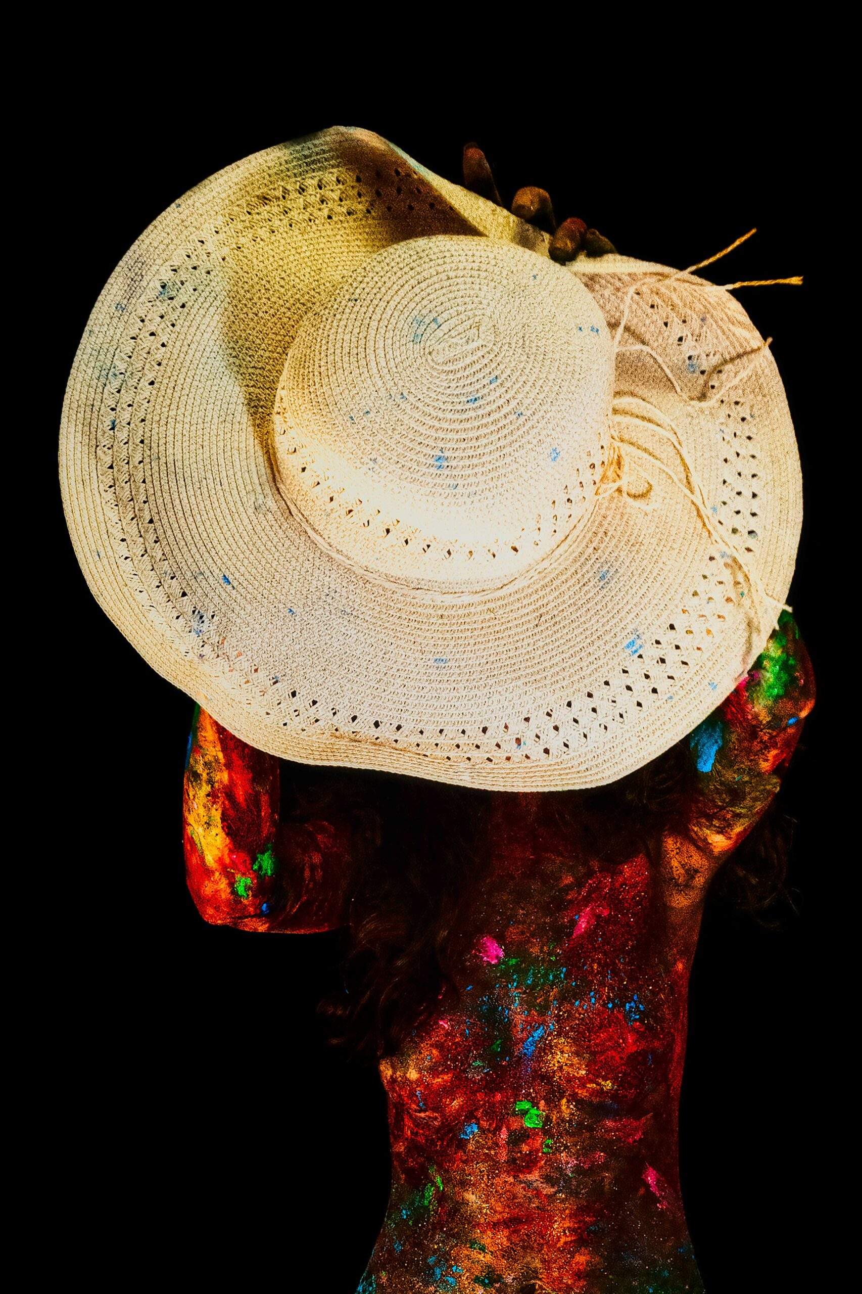 Această fotografie înfățișează o siluetă văzută din spate, încununată de o pălărie de paie cu boruri largi. Textura naturală țesută a pălăriei și perforațiile delicate contrastează puternic cu corpul vibrant și expresiv de dedesubt. Stropi de vopsea intensă roșie, portocalie, verde și albastră erup pe torace, creând un model dinamic, aproape cosmic, pe fundalul negru intens. Compoziția pune accentul pe formă și culoare, transformând figura umană într-o pânză de lumină și textură abstractă.