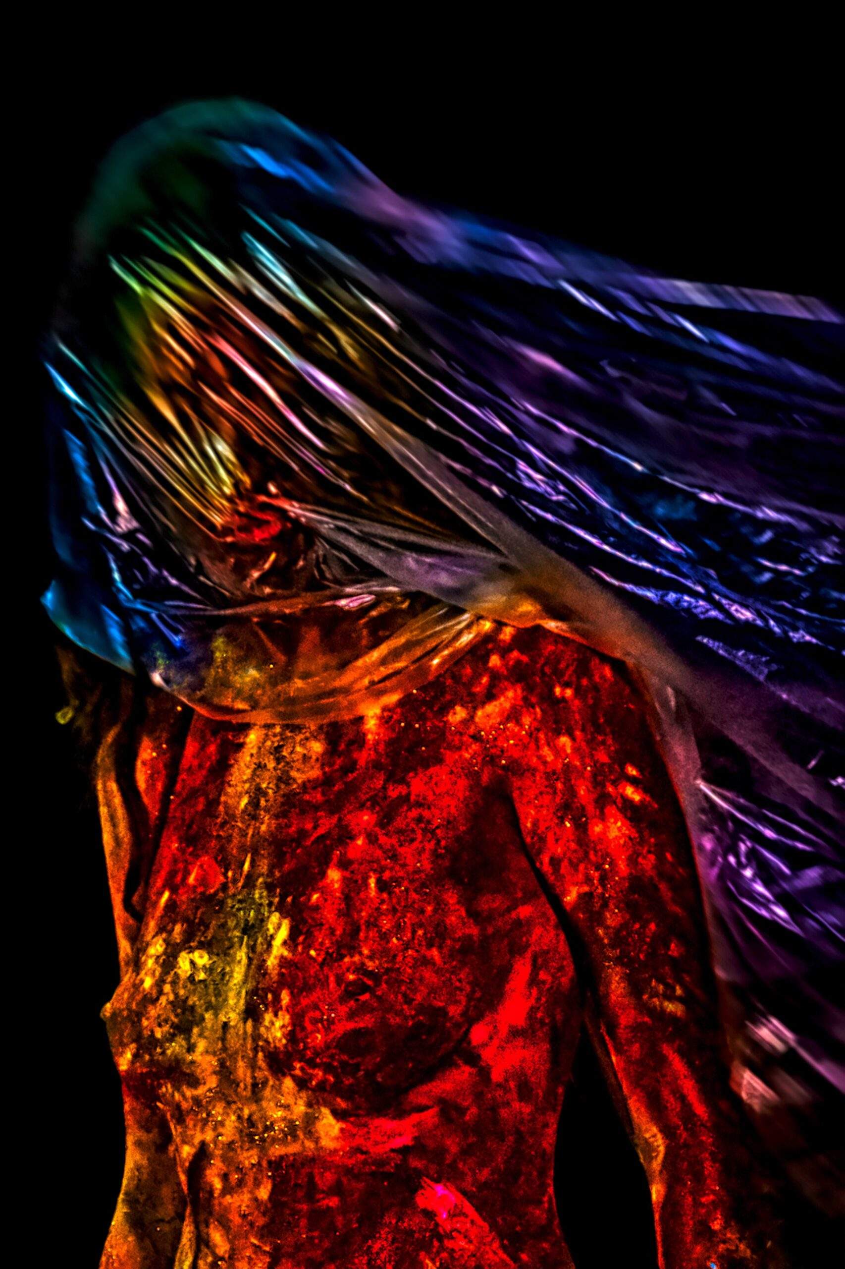 Această fotografie impresionantă surprinde o siluetă învăluită într-un spectru vibrant de lumină și textură. Torsul strălucește în nuanțe intense de roșu, portocaliu și galben, părând pictat cu pigmenți luminoși și granulați. Deasupra, o țesătură translucidă și irizată acoperă capul și umerii, reflectând o cascadă dinamică de albastru, verde și violet. Suprafața șifonată a materialului captează lumina, creând o senzație de mișcare fluidă pe fundalul întunecat. Interacțiunea dintre pielea strălucitoare și țesătura sclipitoare creează o experiență vizuală puternică.